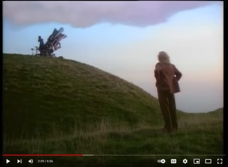 The video’s final minute is cathartic and near mystical. Peter returns to the top of the hill, and this time the cloudbuster produces rain. We see Wilhelm smile inside the car as rain splashes against the back windshield, the rain-streaked camera blurring everything, and, nearing six minutes now, it all culminates in a final image for the ages: a long shot of Peter and the cloudbuster perched on the hill,*********** silhouetted against a foreboding, dark-purplish sky that gradually gives way to some blue at the last second. The sun’s coming out.